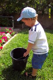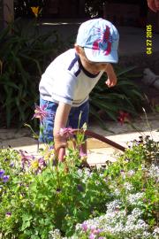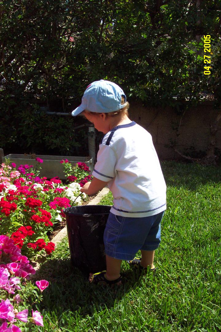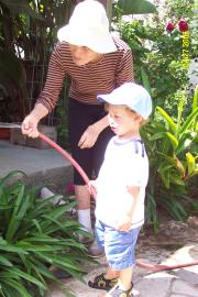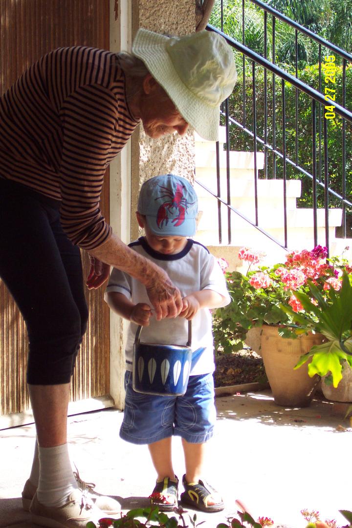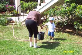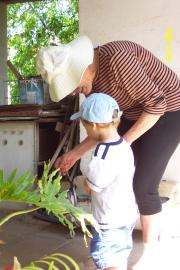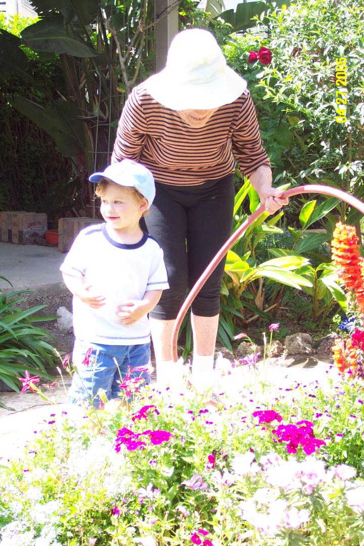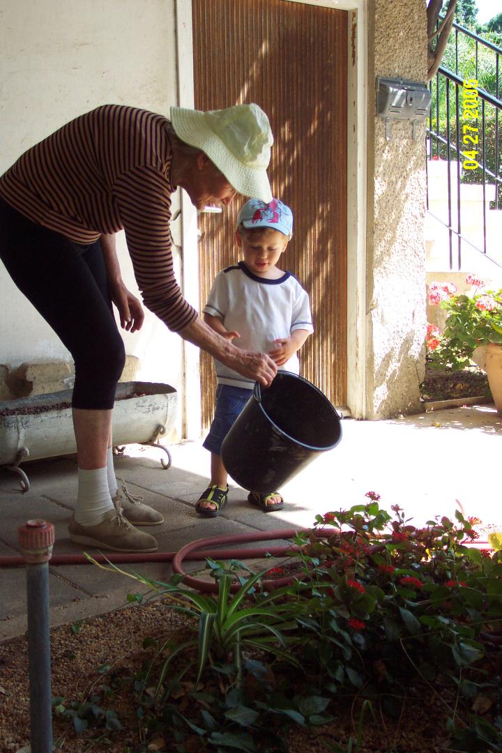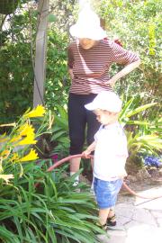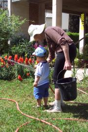 Helping Granny to water her garden. We really love that!
